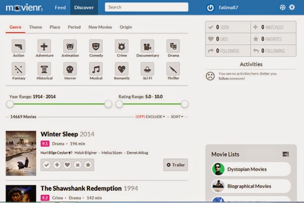 بطبيعة الحال كلنا تقريبا نعتبر أن نهاية الأسبوع هو الوقت المثالي لمشاهدة فيلم الأفلام. لكن السؤال الوحيد هو ما هو الفيلم الذي يستحق المشاهدة ؟ طبعا سؤال صعب ،لكن لحسن الحظ هناك الكثير من الخدمات التي يمكنها ايجاد الاجابة لهذا السؤال ومن بينها movienr وهي خدمة تتيح لك البحث عن الأفلام حسب النوع، الموضوع، المكان وغيرها ليكون اختيارك صائبا وتنعم بنهاية أسبوع ممتعة.